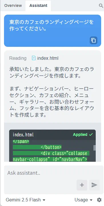 「東京のカフェのLPを作ってください」などと指示を出すだけで、AIが実際にエディタを操作して作業を代行してサイトを作ってしまいます。